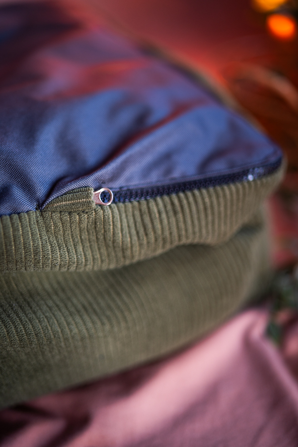 3. Gdy już powróci do swojej formy, złóż legowisko umieszczając pokrowiec z wypełnieniem w pokrowcu zewnętrznym, a poduszki kolejno w bocznych kieszeniach.